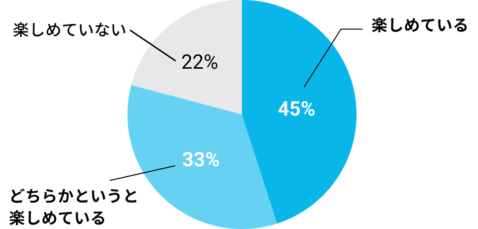 仕事を楽しめている方が約45%、どちらかというと仕事を楽しめている方と含めると、約78%の方が楽しめていると回答しました。